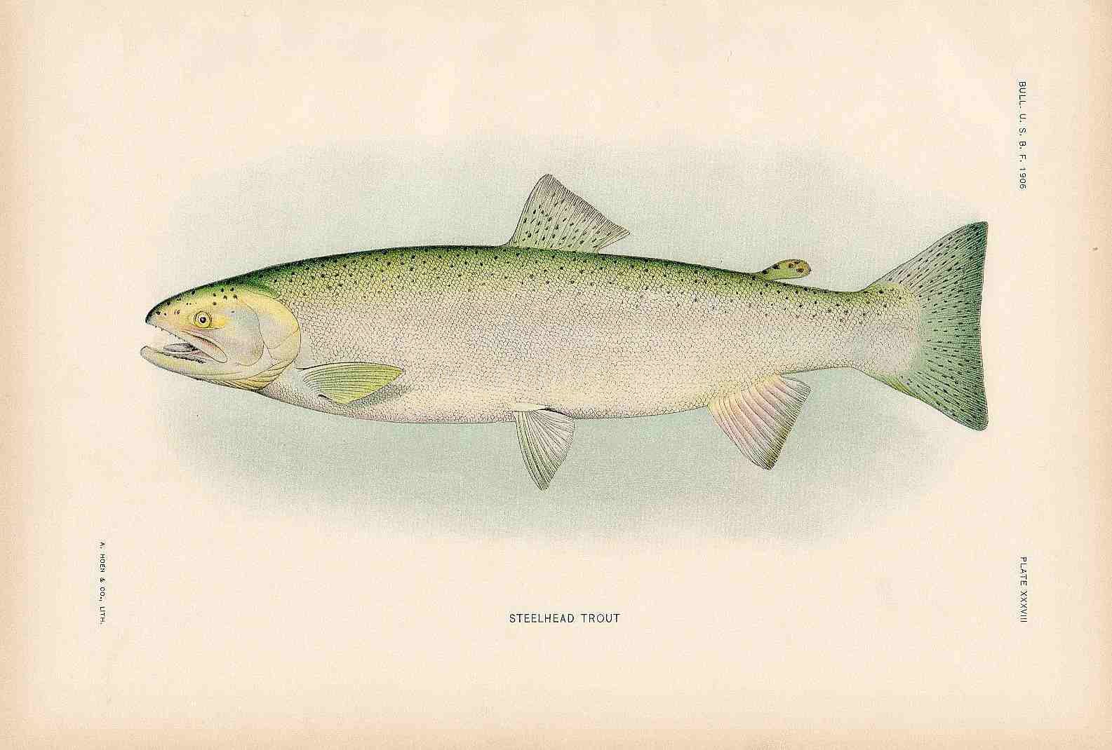 These original and very beautiful chromolithographs are from the Fishes of Alaska, an investigative report of the welfare of salmon fisheries by Barton Evermann and Edmund Lee Goldsborough, published in the US Fish Commission Bulletin for 1906.