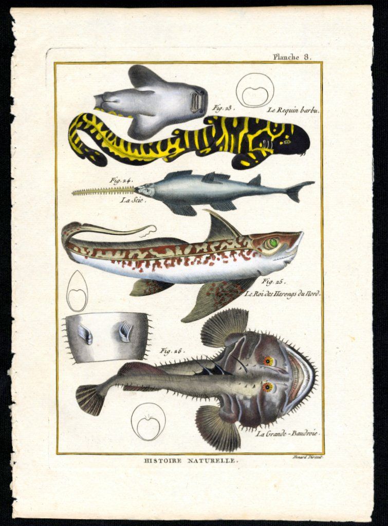 French naturalist, professor and priest, Pierre Joseph Bonnaterre (1752-1804) was commissioned by the publisher Panckoucke to edit the sections on zoology. To illustrate the ichthyology volume, Bonnaterre copied everything that was available of Bloch’s masterpiece and from works by such eminent authors as Catesby, Willughby, Rondelet and Salviani, to assemble a collection of over 400 wonderful species.