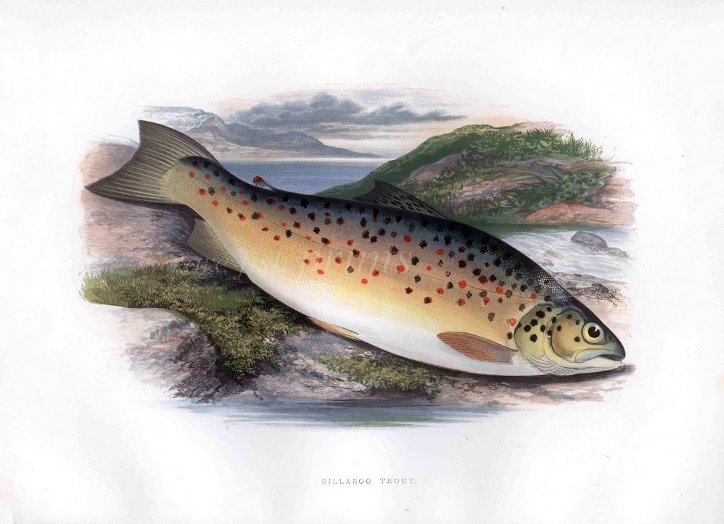These highly attractive fish prints, portrayed in a naturalistic setting, are accompanied where available by a separate chapter of Houghton’s text containing a striking scenic steel engraving of areas where the fish are located. (Ref. Dean, Bibl. of Fishes vol.1, p 605; Wood 1931, p 391)